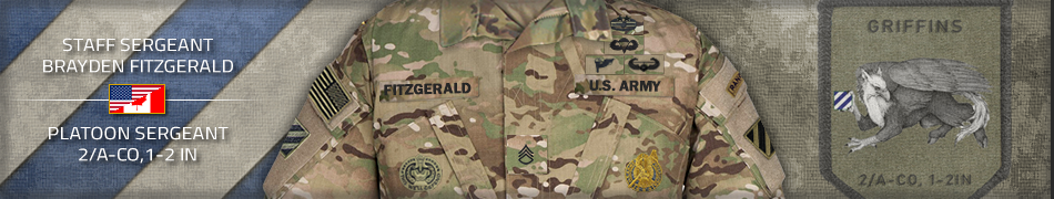During Shaping Operation 12, while moving to a reported enemy artillery position, Wizards came under heavy artillery fire, resulting in significant casualties. The squad was then informed that an enemy convoy was approaching. Recognizing the immediate danger, SSG B. Fitzgerald ordered the squad to rapidly withdraw and call for support, as they were effectively “out of the fight.” Before the squad could escape, the enemy convoy—much closer than previously reported—closed in, led by a Main Battle Tank (MBT). The tank fired its main gun on the already wounded squad, stopping their movement. Realizing the squad had no fire support or air cover to counter the armor threat, SSG Fitzgerald and SPC D. Thorn advanced toward the tank. SSG Fitzgerald employed his M320 grenade launcher to fire smoke rounds at the MBT, immediately followed by a MAAWS shot from SPC Thorn. The tank deployed its own defensive smoke as it shifted fire toward 1st Platoon and 3CAB Soldiers who were reinserting into the area. Seeing an opportunity to create space between the tank and their wounded squad, SSG Fitzgerald and SPC Thorn maneuvered through the smoke to engage the MBT. As they closed in, SSG Fitzgerald prepared his AT4 to disable the vehicle. Upon reaching the tank’s position, the MBT suddenly turned and charged through the smoke, attempting to run him down. Despite being surprised by its proximity, SSG Fitzgerald fired a disabling AT4 shot before being struck by the vehicle, sustaining severe injuries, including both legs and an arm broken. Realizing his wounds were mortal and that the MBT’s gun was still operational and attempting to engage SPC Thorn and friendly forces, SSG Fitzgerald shouted for SPC Thorn to withdraw. While critically wounded and positioned beside the immobilized tank, SSG Fitzgerald placed two demolition charges on the vehicle. As SPC Thorn moved to safety, SSG Fitzgerald detonated the explosives, destroying the MBT and preventing further casualties among 1st Platoon and 3CAB