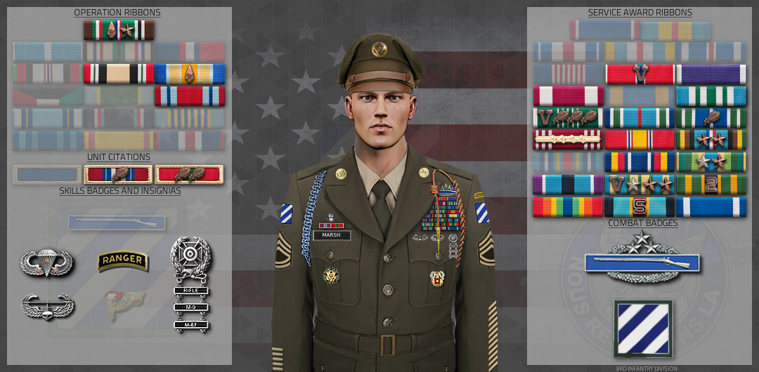 Combat Star (3rd Award) Sergeant First Class David Marsh The Secretary of the Army has reposed special trust and confidence in your patriotism, valor, fidelity and professional excellence. In view of these qualities, your demonstrated leadership potential, and dedicated service to the United States Army and the unit, you are, therefore, awarded the Combat Star (3rd Award). Awarded: Jan 5, 2025 Signed: Major John LaFlash |