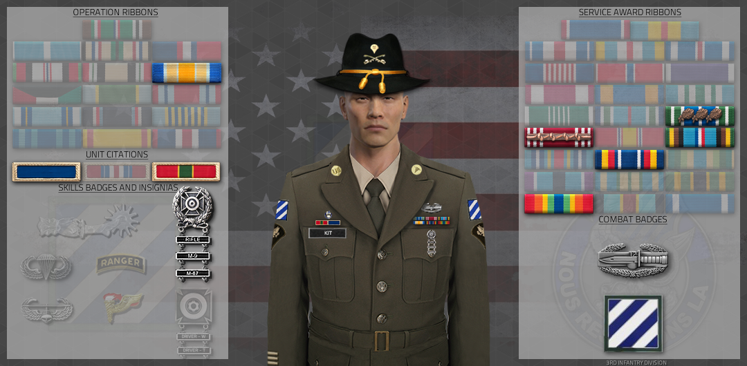 For outstanding achievement during Mission TumbleWeed. While rapidly maneuvering between objectives under strict time constraints, Specialist Kit observed suspicious enemy activity and immediately notified his leadership. Demonstrating initiative and determination, he led his squad to investigate the position despite coming under small-arms fire. His actions enabled the squad to conduct reconnaissance and a swift raid on a concealed enemy fighting position. Specialist Kit’s keen observation and decisive leadership directly resulted in the discovery and destruction of a hidden bunker and mortar systems that posed a significant threat to 1st Platoon and his squad. His performance brings great credit upon himself, his unit, and the United States Army.