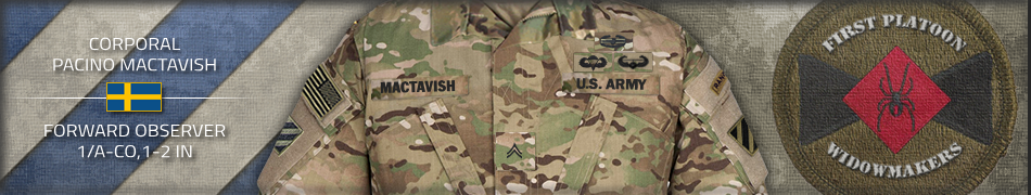 Over the past several months, SPC MacTavish has transitioned into the role of Radio Telephone Operator with ease. He has several times over the past missions been able to set up Landing Zones and Supply Requests with haste and accuracy to support the operations of 1st Platoon “Widowmakers”. The Specialist’s dedication to learning his new craft has not gone unrecognized and brings great credit upon himself and 1st Platoon, Alpha Company.