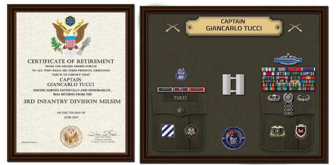 It is therefore, with great pride and conviction, 1LT G. Tucci will be awarded both the Soldier’s Medal and the Defense Superior Service Medal—in honor of his distinguished service, enduring leadership, and unparalleled contributions to the 3rd Infantry Division Realism Unit..