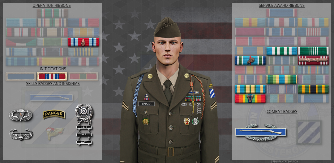 SPC Badger has carried himself with distinction over the past 3 months he has blown through the ranks of the 3rd Infantry Division, showing his talent and dedication to his squad on Saturdays quickly learning the knowledge required to assist with Squad Drills while on Sunday being a key figure of 4th squad. His quick learning and quick action over the deployment has assisted Fourth Squad and Platoon at enhancing mission readiness and effectiveness of the Squad. His skills with the Javelin was paramount in scrapping enemy armor columns and mechanized platoons with over 20 armor kills and dozens M-kills. His actions have directly led to the success of 1st Platoon, assisting in the elimination of 110th Motor BN and 44th Mechanized BN.