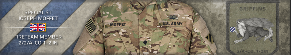 During mission Benelux, Wizards was under heavy fire supporting a fallback position for Warlocks. While attempting to fix and neutralise a position of enemy armour, the AT gunner for the fireteam went down. Understanding the severity and time-sensitivity of the situation, PFC Moffet acted quickly and instinctively to deploy smoke grenades, advance to the downed soldier while maintaining effective suppression himself, then requested an increased rate of fire from the rest of the team as he dragged the wounded soldier out of the line of fire and performed life-saving triage on them. For his quick thinking, and demonstration of courage, PFC Moffet saved his squadmate and earned an AAM at the same time.