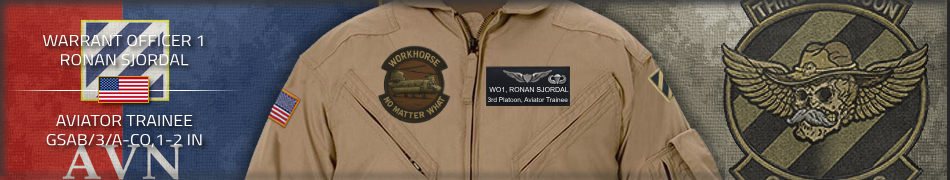 U.S. Army Aviator Wings Warrant Officer 1 Ronan Sjordal The Secretary of the Army has reposed special trust and confidence in your patriotism, valor, fidelity and professional excellence. In view of these qualities, your demonstrated leadership potential, and dedicated service to the United States Army and the unit, you are, therefore, awarded the U.S. Army Aviator Wings. Awarded: Jan 4, 2026 Signed: Major John LaFlash |