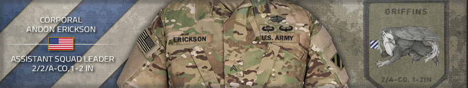 ![]() For exceptionally meritorious achievement during Shaping Operation 8. Corporal A. Erickson distinguished himself while conducting a reconnaissance movement with a small fireteam. During the movement, his element came under intense fire from a platoon-sized enemy force to their rear. Without hesitation, Corporal Erickson established a base of fire, allowing his injured Soldiers to fall back to recover and receive medical attention. Despite being urged to withdraw, he chose to hold his position and delivered accurate, sustained fire that neutralized the enemy force. Corporal Erickson’s decisive actions, courage under fire, and steadfast devotion to his Soldiers directly preserved the combat effectiveness of his fireteam and reflect great credit upon himself, his unit, and the United States Army.