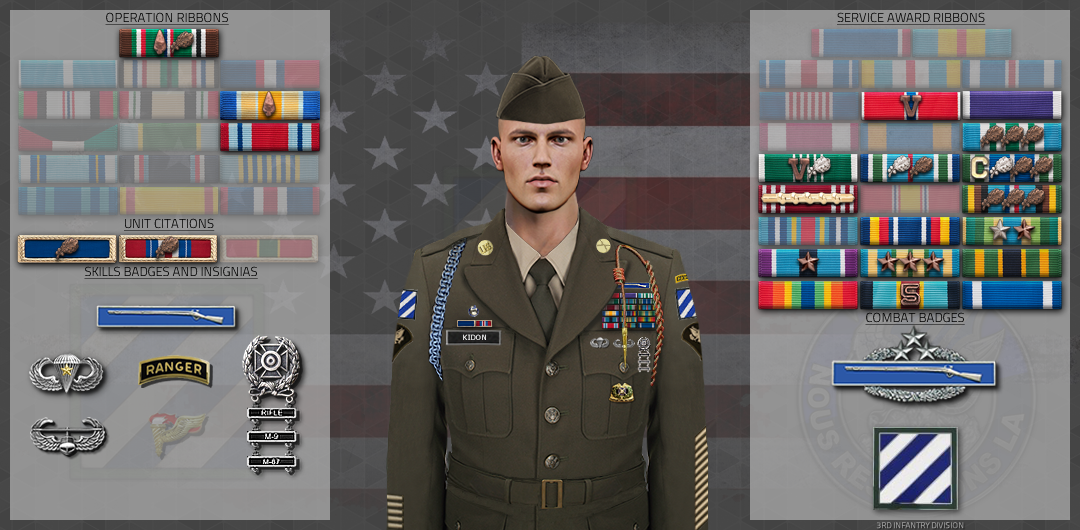 SPC S.Kidon During Mission Snowstorm: SPC Kidon took the role of Squad Medic for the combined First and Second squads, while performing his duties as Squad Medic during a Platoon wide mass casualty event, he was able to save multiple people not only from his own squad but also from fourth squad as well. Just 15 minutes later the platoon moved towards a roadway where there was intel that they would be flanked by a large QRF force. SPC Kidon while tending to soldiers that had been heavily wounded to the QRF force was also able to stabilize a large part of the soldiers on the ground before taking an enemy vic from inside a compound, SPC Kidon caring little for his own well being and seeing the grim situation facing first platoon and realizing there was not enough rifles on the line to defend the CCP SPC Kidon moved the damage vehicle out to the main road, using the mounted M2 .50 Cal turret to eliminate three squads worth of paratroopers that would have overrun the friendly forces in that area. Without his help a large portion of 1st and 4th squad's leadership would have succumbed to their injuries, and the paratroopers would have been able to make an advance on the CCP and overrun it. SPC Kidon’s actions uphold the standards all 3rd Infantry Division soldiers should strive to achieve. His Selfless Service, Courage, and Loyalty to the platoon are held in high regard by 3rd Infantry Division, 1st Battalion, Alpha Company, 1st Platoon Widowmakers.