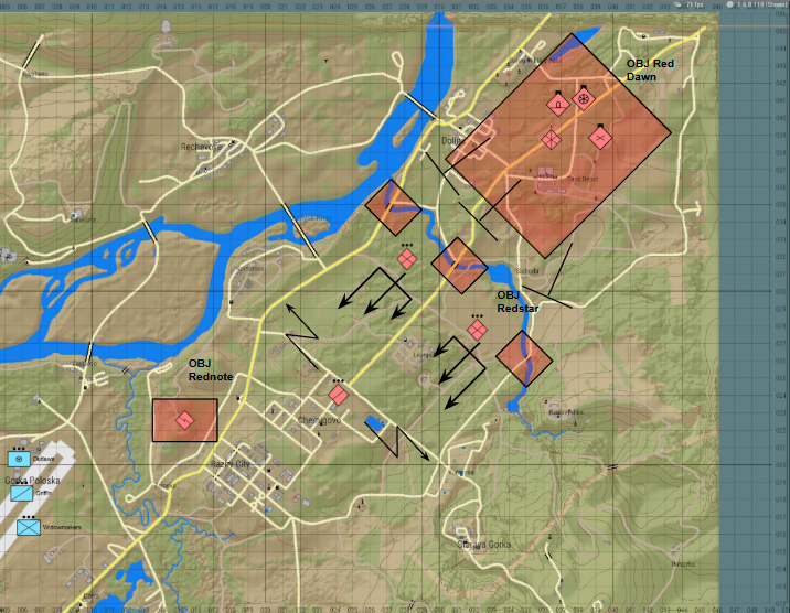 Company A- This is a militia type element with two Platoons of Infantry and one Platoon of Reconnaissance. This element mainly consists of light infantry, light reconnaissance elements, and 3-4 technicals. They currently have a small fortified position at a forward OP in OBJ Rednote consisting of 2-3 squads and dug in positions. The platoon of Reconnaissance is currently conducting a Screen to Delay West of OBJ Redstar. The remainder of the two Platoons of light Infantry are currently in defensive positions IVO the three bridge crossings. Their disposition and composition in that area is currently unknown. Important note: Once contact is made on OBJ Rednote, there will be 10 minutes until other forces are notified of your presence in the AO.