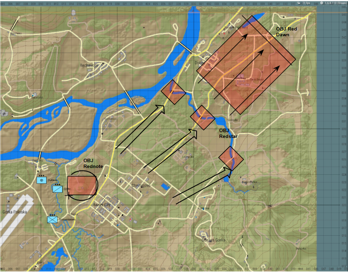 - OBJ Red Dawn- Movement to Contact to clear enemy transportation, ammunition, and military installations.