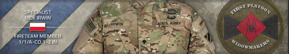 During Mission Shaping Effort #10, 1st Squad took heavy fire from the trenchline of OBJ December, during which the entirety of 1st Squad was wiped out, SPC Irwin being the last man in the squad was able to get on Platoon Net and inform the other squads of the mass cas as well as get help in eliminating the enemy forces. Unfortunately during this time SPC Irwin wasn’t able to save everyone and as the last man in the AO, began to take IDF and direct sniper fire. He was able to move around the IDF and sniper fire taking cover while moving back towards 1st Squads Stryker to defend with it and hold the position for the rest of the squad to come back to. SPC Irwin was able to successfully hold his position throughout the fight while alone, until the rest of the squad was able to re-insert.