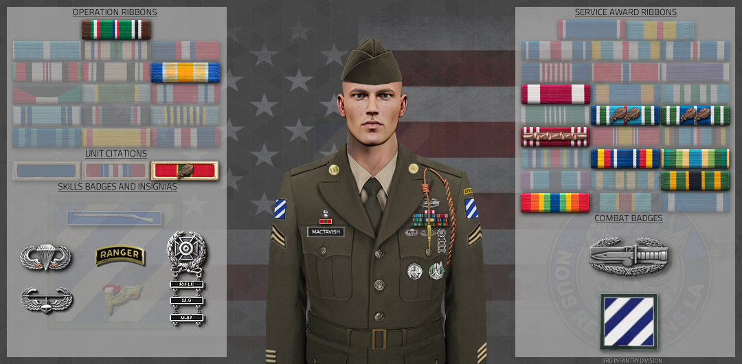 ![]() 3rd Infantry Division Combat Unit Patch Corporal Pacino MacTavish The Secretary of the Army has reposed special trust and confidence in your patriotism, valor, fidelity and professional excellence. In view of these qualities, your demonstrated leadership potential, and dedicated service to the United States Army and the unit, you are, therefore, awarded the 3rd Infantry Division Combat Unit Patch. Awarded: Jun 8, 2025 Signed: Major John LaFlash |