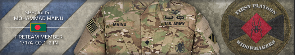 Combat Star Specialist Mohammad Mainu The Secretary of the Army has reposed special trust and confidence in your patriotism, valor, fidelity and professional excellence. In view of these qualities, your demonstrated leadership potential, and dedicated service to the United States Army and the unit, you are, therefore, awarded the Combat Star. Awarded: Dec 7, 2025 Signed: Major John LaFlash |