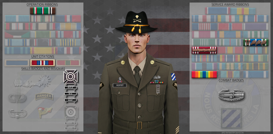 During mission Benelux, Wizards was under heavy fire supporting a fallback position for Warlocks. While attempting to fix and neutralise a position of enemy armour, the AT gunner for the fireteam went down. Understanding the severity and time-sensitivity of the situation, PFC Moffet acted quickly and instinctively to deploy smoke grenades, advance to the downed soldier while maintaining effective suppression himself, then requested an increased rate of fire from the rest of the team as he dragged the wounded soldier out of the line of fire and performed life-saving triage on them. For his quick thinking, and demonstration of courage, PFC Moffet saved his squadmate and earned an AAM at the same time.