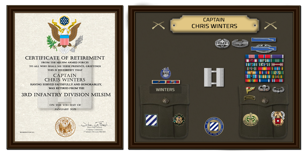 European Campaign (ECM) First Lieutenant Chris Winters The Secretary of the Army has reposed special trust and confidence in your patriotism, valor, fidelity and professional excellence. In view of these qualities, your demonstrated leadership potential, and dedicated service to the United States Army and the unit, you are, therefore, awarded the European Campaign (ECM). Awarded: Jan 5, 2025 Signed: Major John LaFlash |