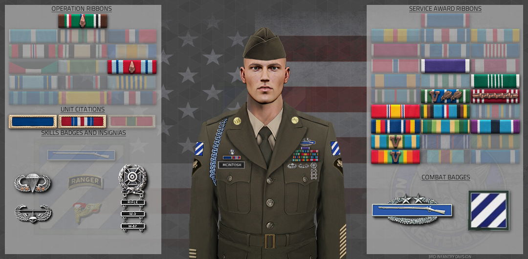 3rd Infantry Division Combat Unit Patch Specialist Nicholas Mcintosh The Secretary of the Army has reposed special trust and confidence in your patriotism, valor, fidelity and professional excellence. In view of these qualities, your demonstrated leadership potential, and dedicated service to the United States Army and the unit, you are, therefore, awarded the 3rd Infantry Division Combat Unit Patch. Awarded: Aug 3, 2025 Signed: Major John LaFlash |
