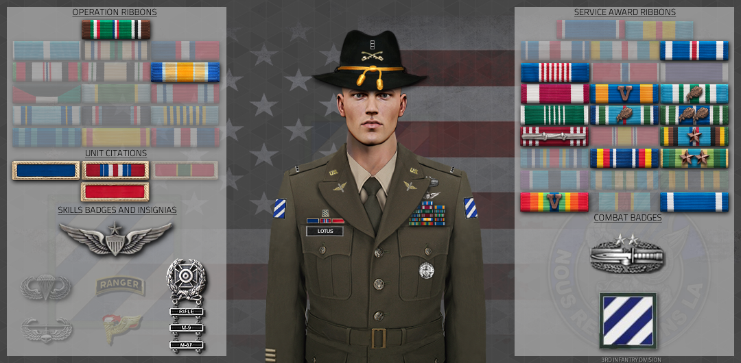 3rd Infantry Division Combat Unit Patch Chief Warrant Officer 3 Dave Lotus The Secretary of the Army has reposed special trust and confidence in your patriotism, valor, fidelity and professional excellence. In view of these qualities, your demonstrated leadership potential, and dedicated service to the United States Army and the unit, you are, therefore, awarded the 3rd Infantry Division Combat Unit Patch. Awarded: Jun 8, 2025 Signed: Major John LaFlash